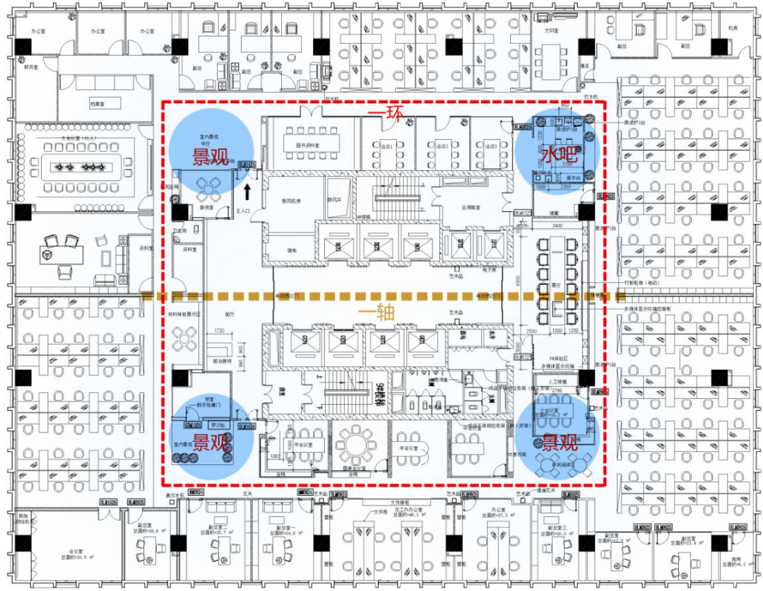“一環” 作為(wei) 空間主要的功能動線,簡潔明了,鏈接所有辦公板塊和領導辦公室,實現辦公效率的最大化。