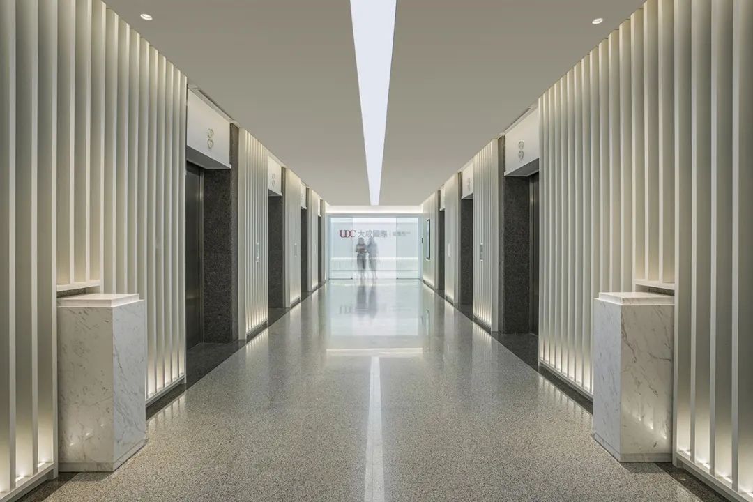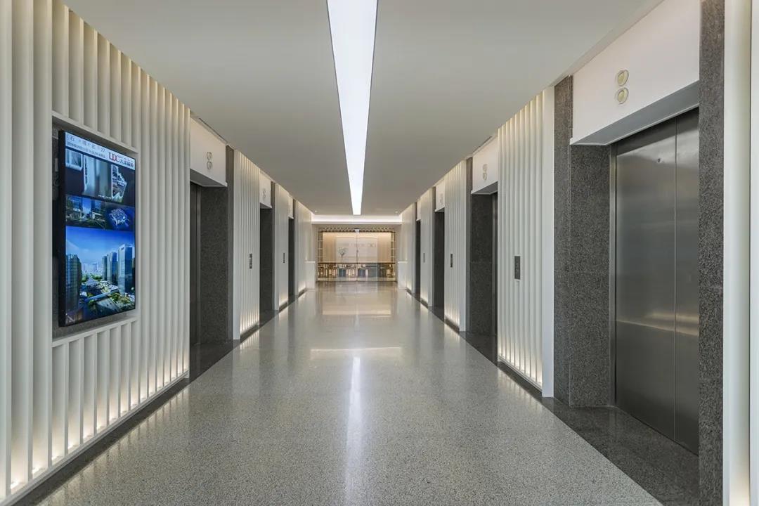 “一軸” 包含樓層電梯廳、企業(ye) 門廳、展廳,強調對空間儀(yi) 式感的營造;