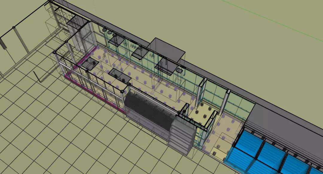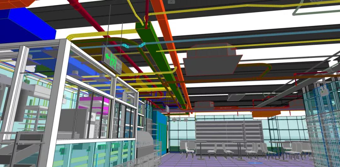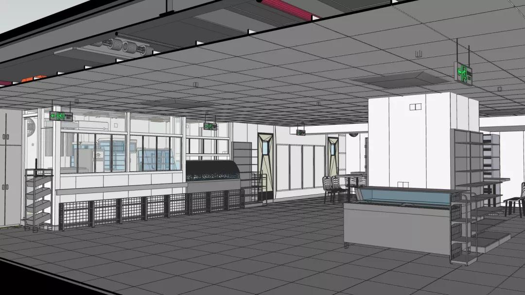 店鋪分為客區和廚區兩大區域,涉及到裝修、強弱電、給排水、通風、空調、消防等多種專業,涉及到甲方的家具和設備廠家10餘家。設備數量共計30餘種,僅強電麵板插座就有150餘個。專業交叉多,管線複雜,現場條件苛刻,疫情期間的各種管控帶來的人員管理和材料采購困難都是此次項目實施的難點。而“BIM+裝配式”就在此刻助力店鋪快速落地,精準實施。