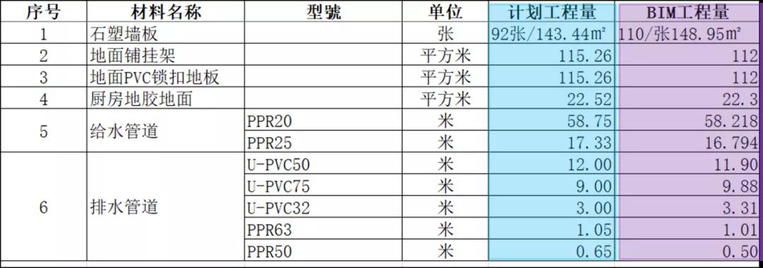 5、工程量的統計。通過BIM的模型對各種材料量的統計可以快速生成報價,同時指導實際的材料使用量。