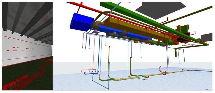 廚區隔斷是電氣設備集中,各類專業管線(強弱電、給水)、交叉最多的部位。利用BIM技術對各類管線進行有序的布置,所有的電氣管線、麵板都在工廠預製完成,隔斷頂部預留接線盒。隔斷分片運輸,現場組裝成整體,頂部線盒完成接線。