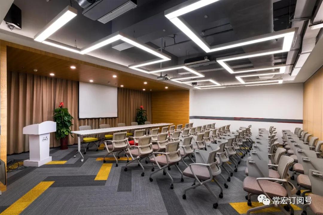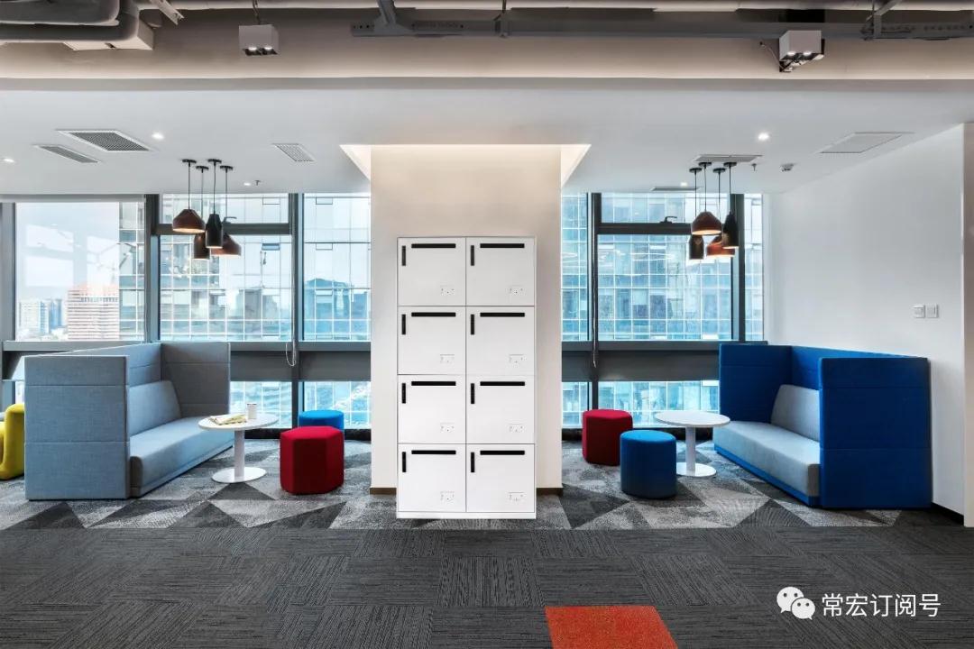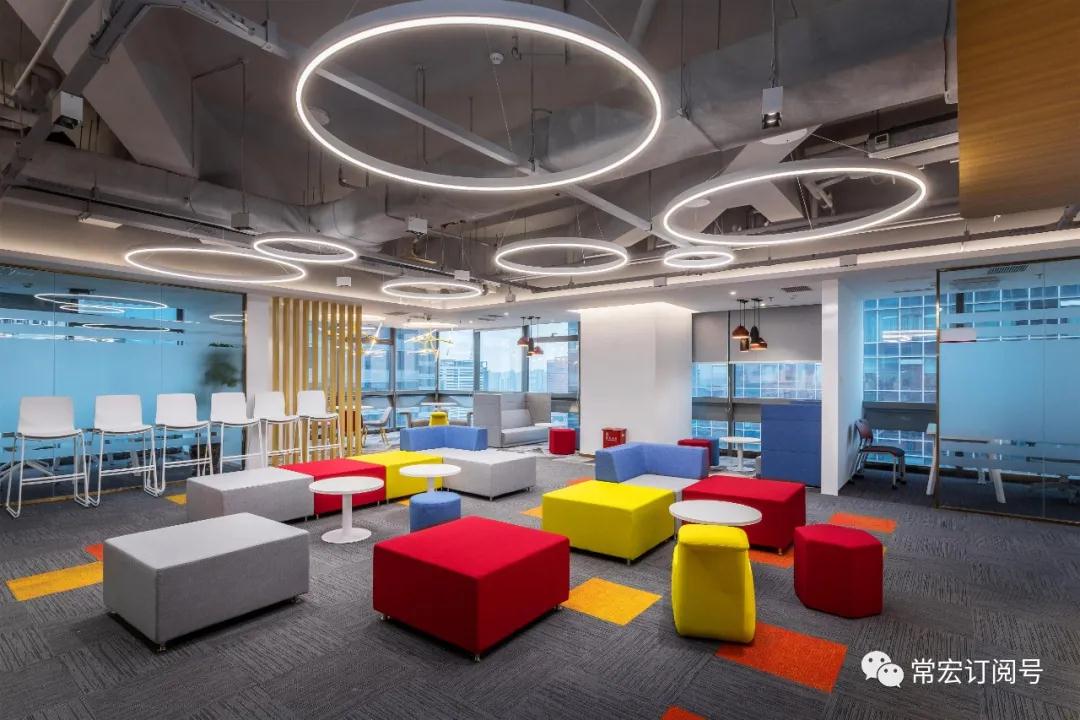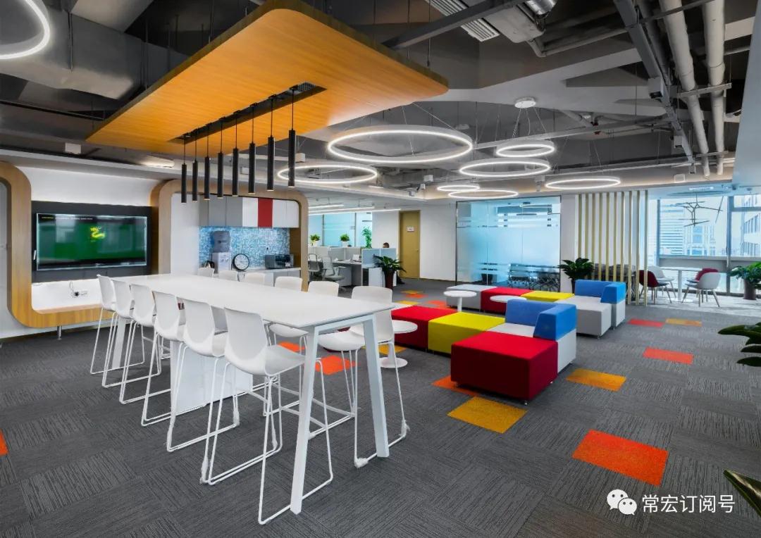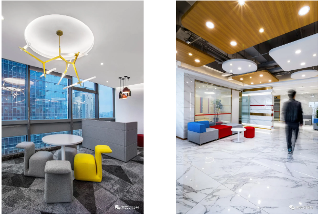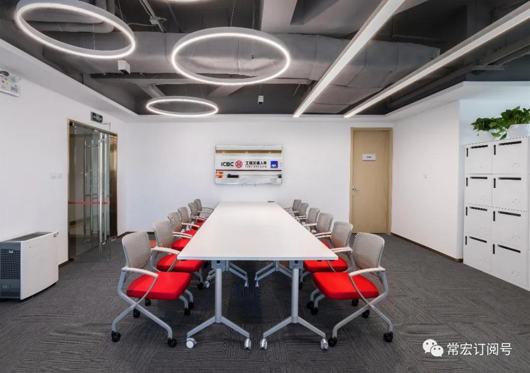 這種風格貫穿始終,同時也在燈具上被體(ti) 現出來,主要空間采用了細長的磁吸燈具,顯得頂麵幹淨簡潔,細長深色的磁吸燈和吊掛軌道燈又能夠襯托出工業(ye) 風格。此外,設計師根據不同空間屬性變化,在空間中點綴工銀安盛的VI跳色,使整體(ti) 增添了親(qin) 切、溫暖、靈動的感覺。