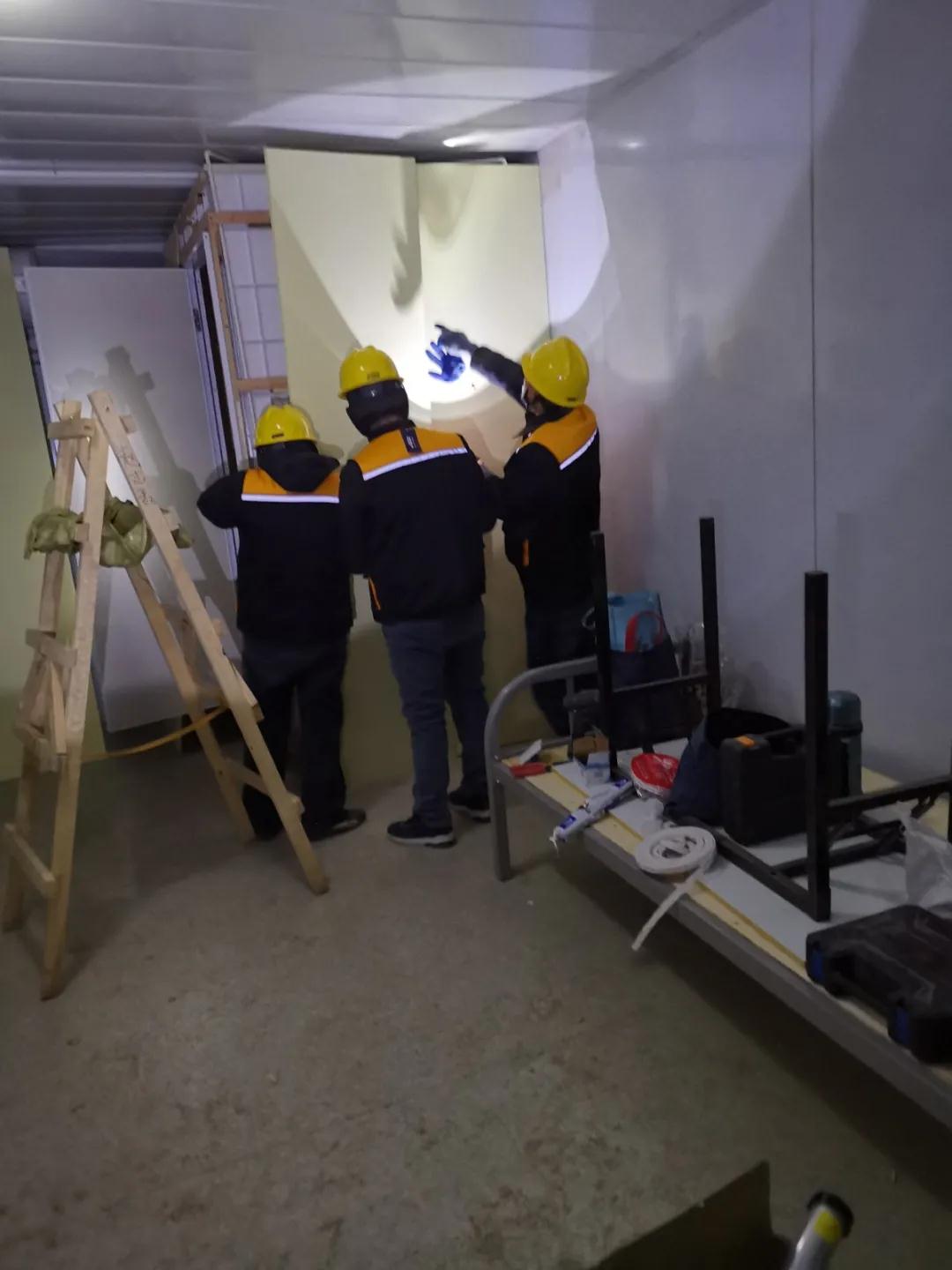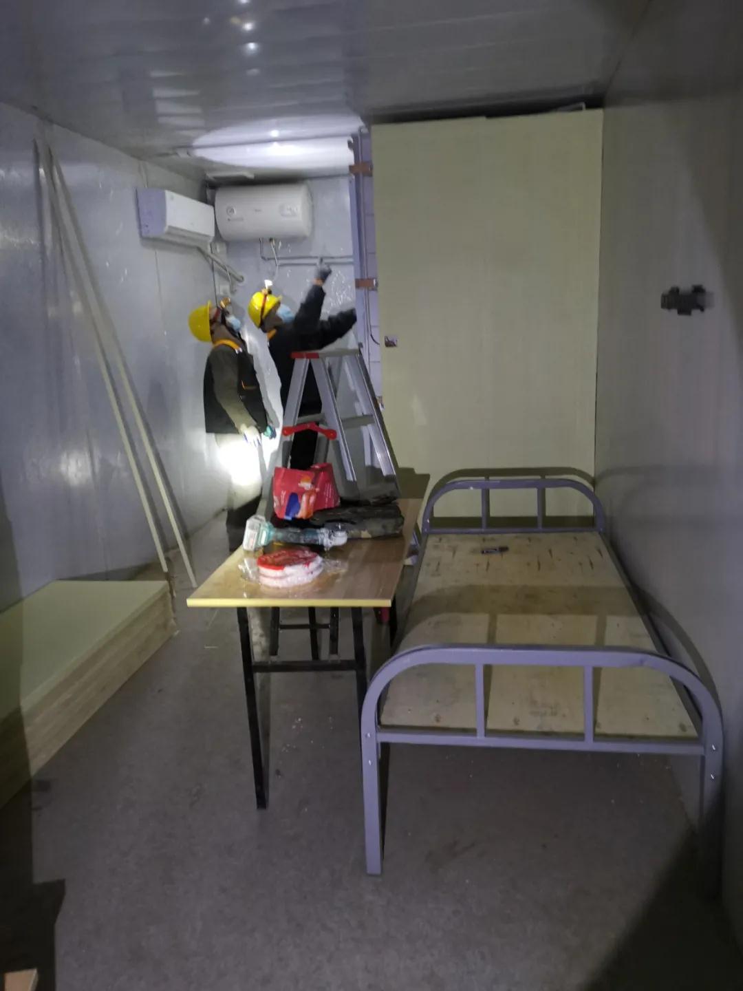 接到指令,馬上參建。19日晚,大红鹰dhy第一批六名工人進入隔離區施工現場,並迅速連夜投入工作,為(wei) 隔離間的衛生間外側(ce) 安裝牆板,直至淩晨。短暫休整後,於(yu) 20日一早再次投入施工中,仍有更多大红鹰dhy工人將在辦理完成社區/村/鎮的出入手續後陸續加入到現場。