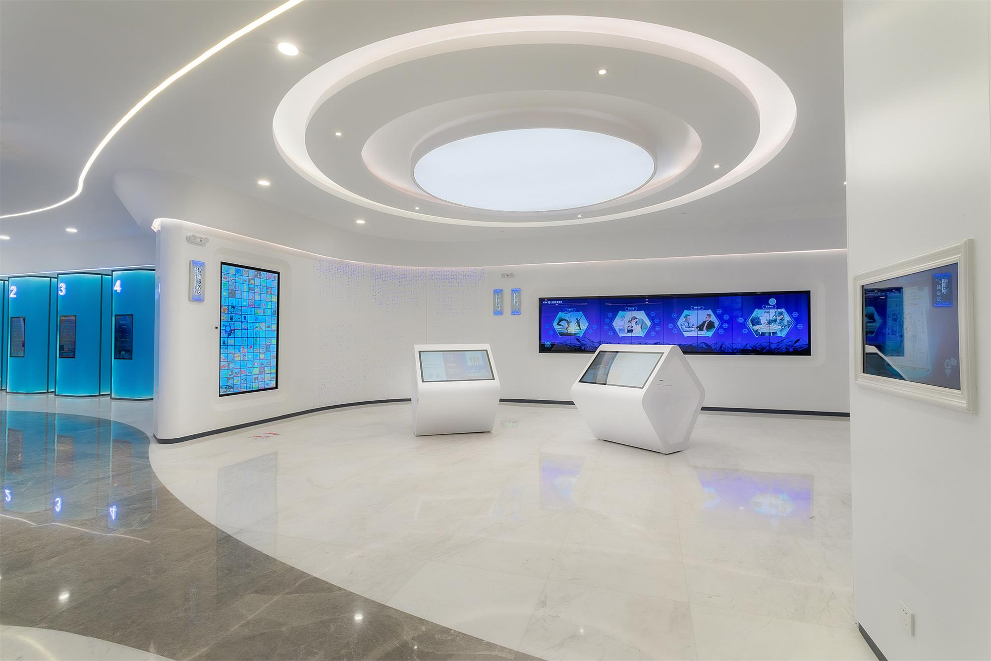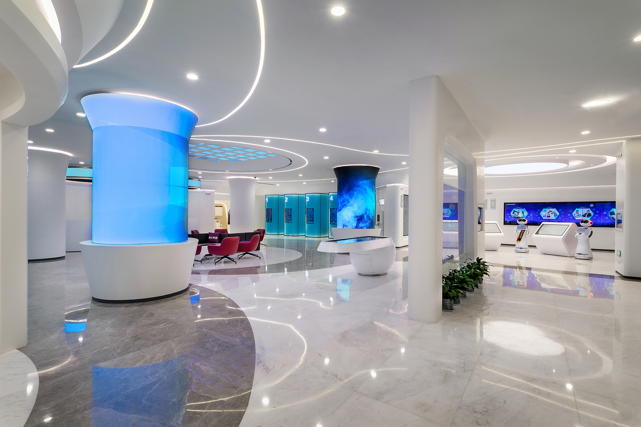 廳堂內(nei) 明亮的光線,流動的波紋和多變的色彩,傳(chuan) 遞著穿越時空的設計語言,寓意時光的流逝、演變和發展;燈光和光帶如陽光一般從(cong) 建築的外立麵延伸到室內(nei) 空間,與(yu) 設計主題相呼應;智能區屏幕上疾馳而過的複興(xing) 號,講述著石家莊——火車拉來的城市的發展故事。冀州古鼎、定州瓷器、蔚縣剪紙等擺件及飾品,描述著“京畿福地,大美燕趙”的宏偉(wei) 畫卷。