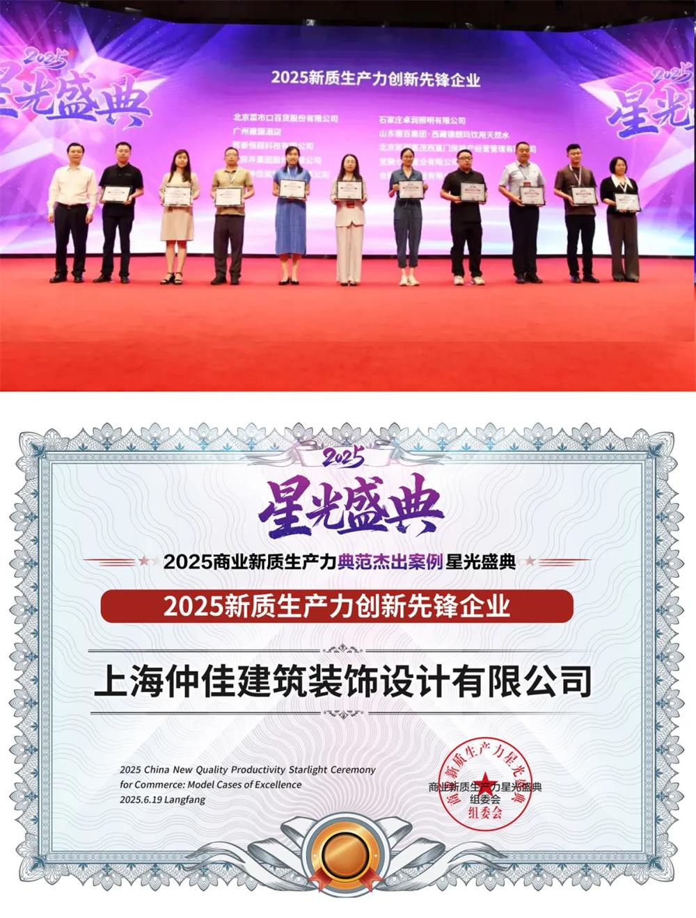 旗下子公司上海仲佳設計此次榮獲“創新先鋒企業(ye) ”,充分體(ti) 現了集團在創新領域的深度布局。上海仲佳設計以“設計+科技”為(wei) 驅動,將AI設計工具、虛擬現實(VR)技術與(yu) 傳(chuan) 統裝飾結合,為(wei) 客戶提供更高效、更沉浸的解決(jue) 方案,成為(wei) 行業(ye) 創新實踐的典範。