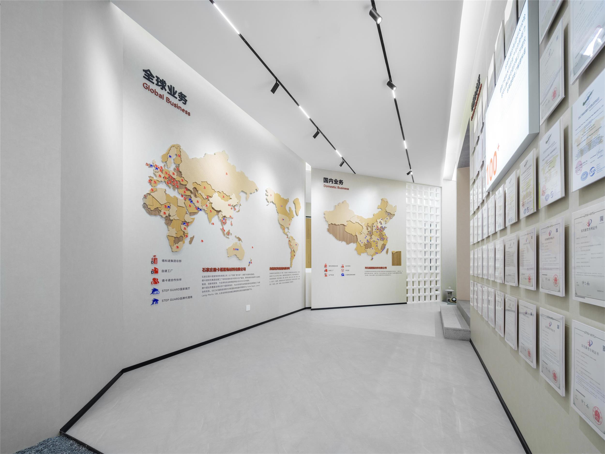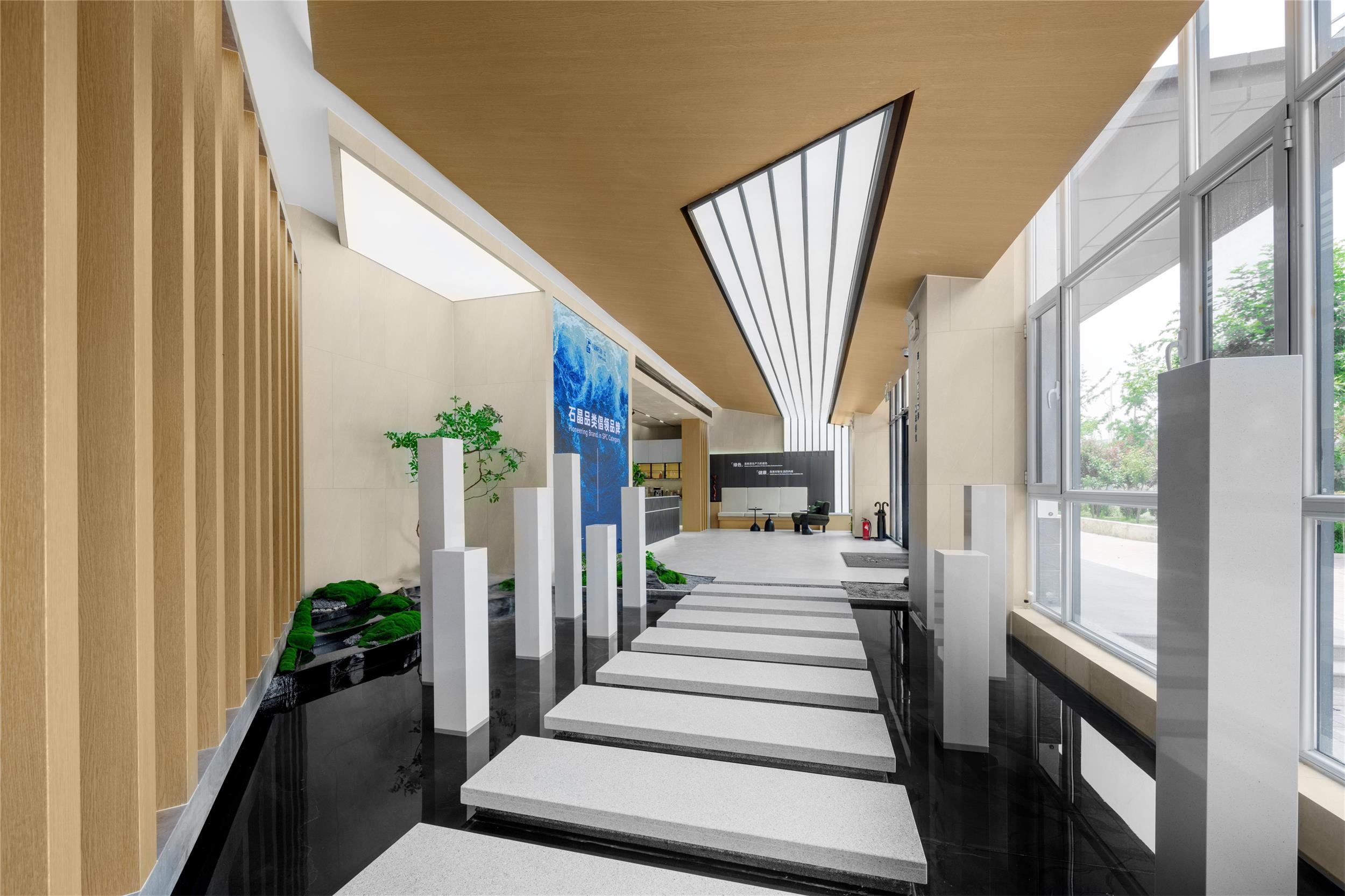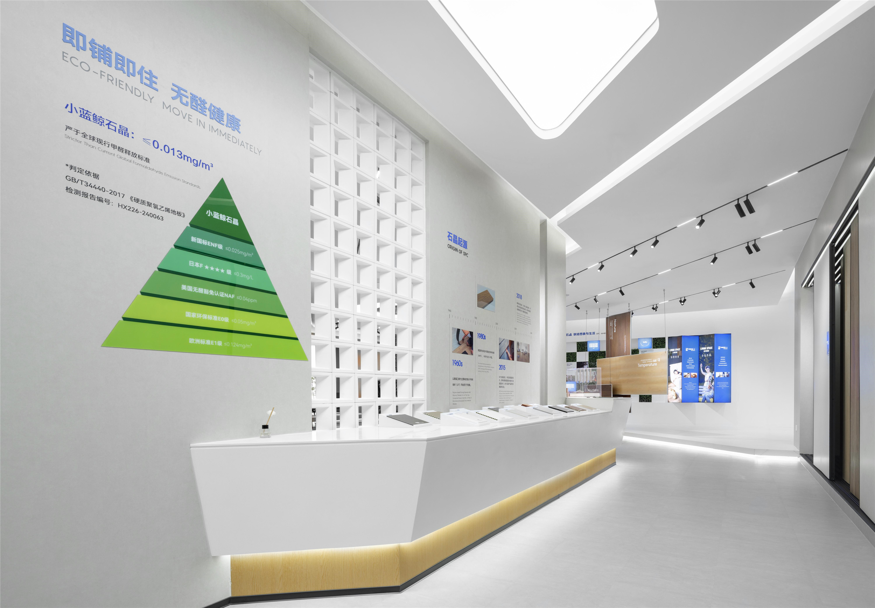 小藍鯨正定保稅區品牌形象展廳立足於企業曆史文化的戰略性總結,以524平方米的一層空間為載體,融合品牌宣傳、產品展示、客戶接待等多重功能。作為連接辦公空間與生產園區的樞紐,展廳不僅承載著品牌形象的對外傳播,更通過設計的力量,將企業文化與創新精神具象化。